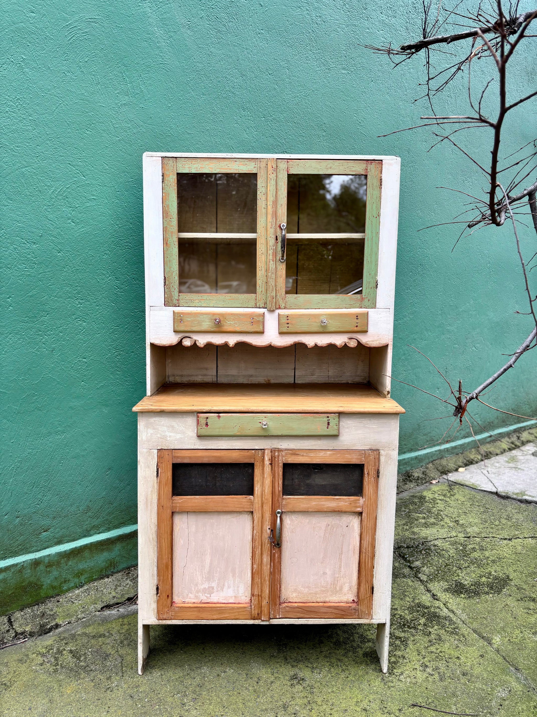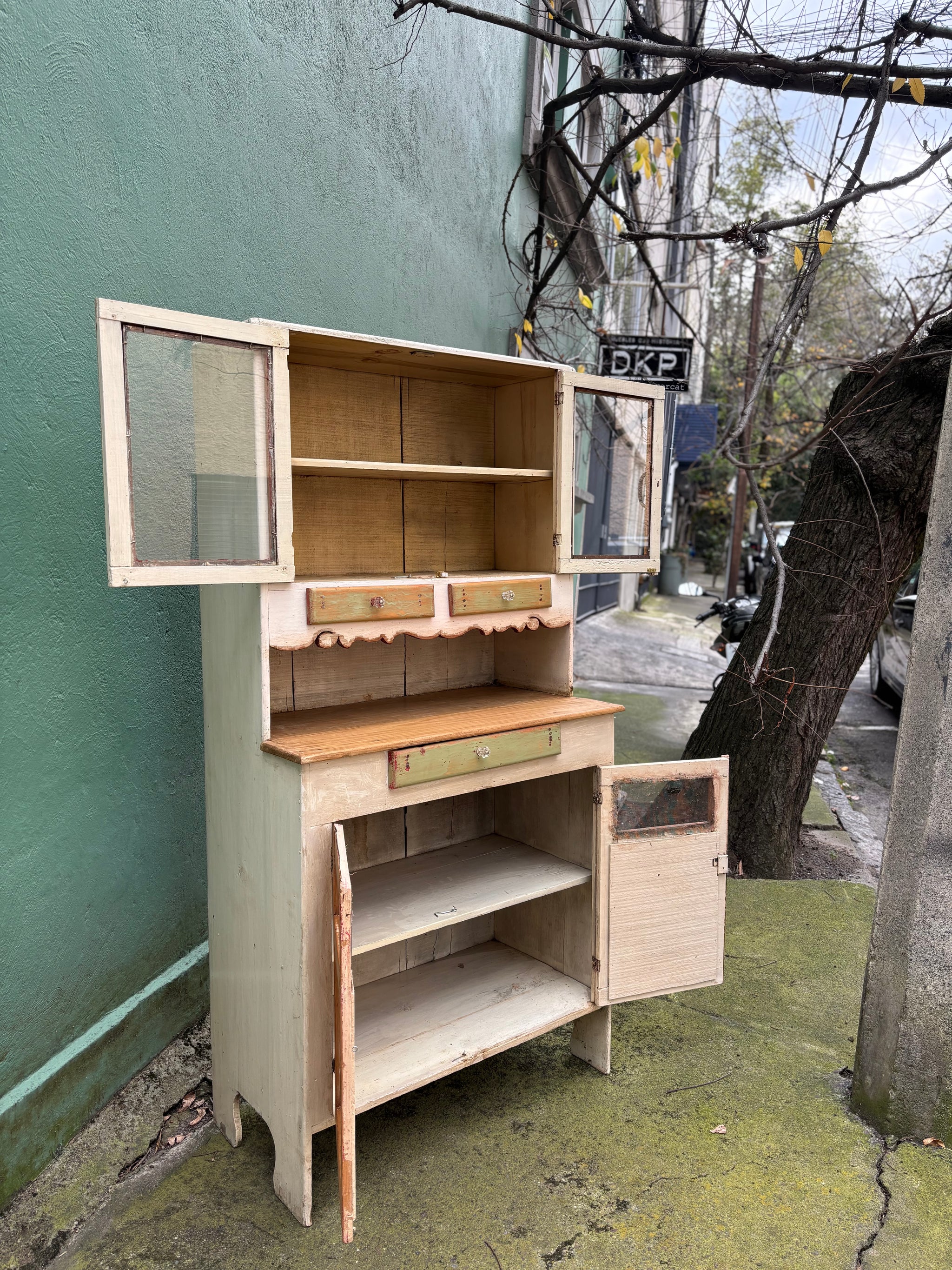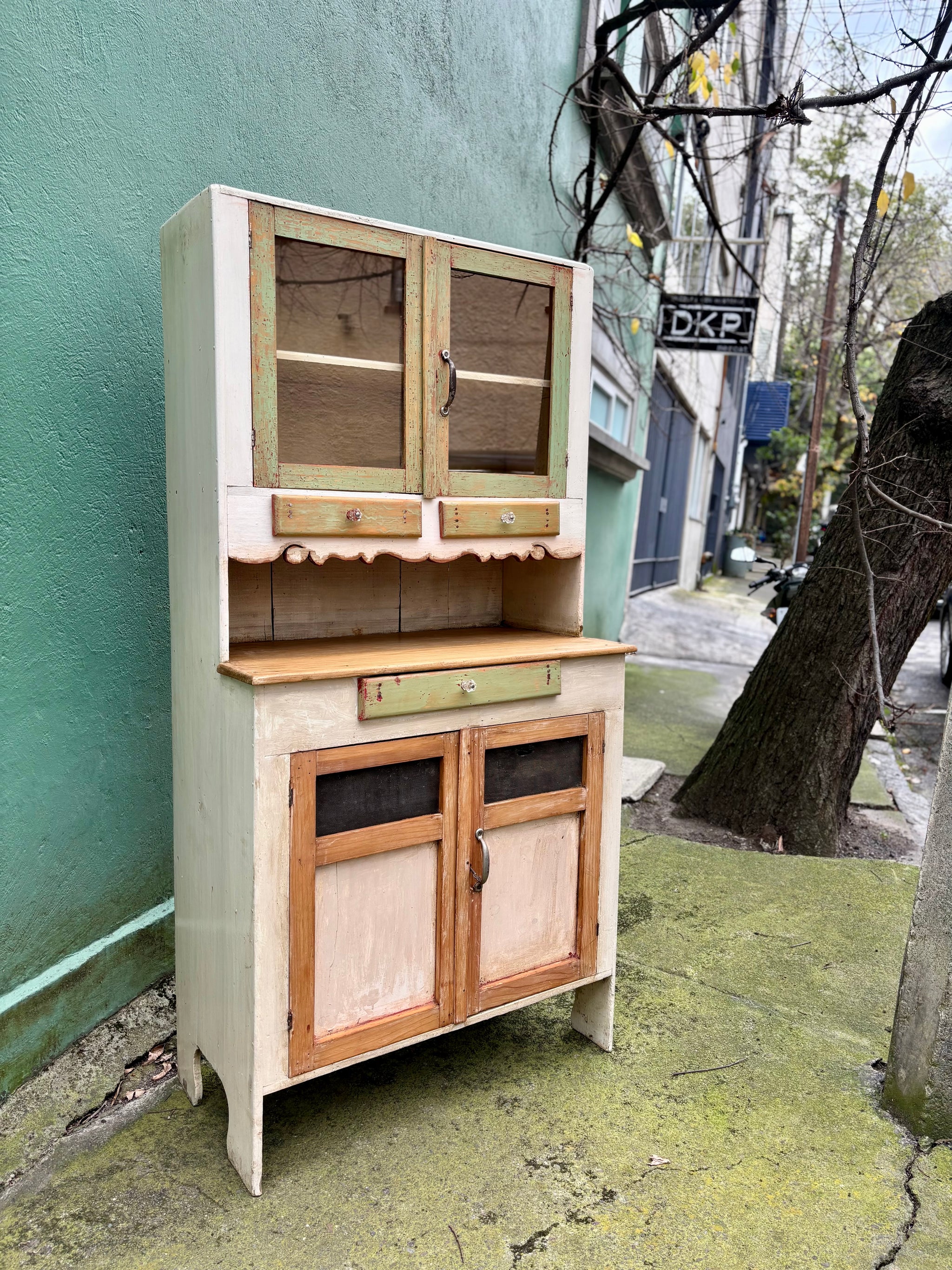 Antigua Alacena de cocina con pátina original, moldura tallada, cubierta de madera, jaladeras originales, elaborada a principios del siglo XX.