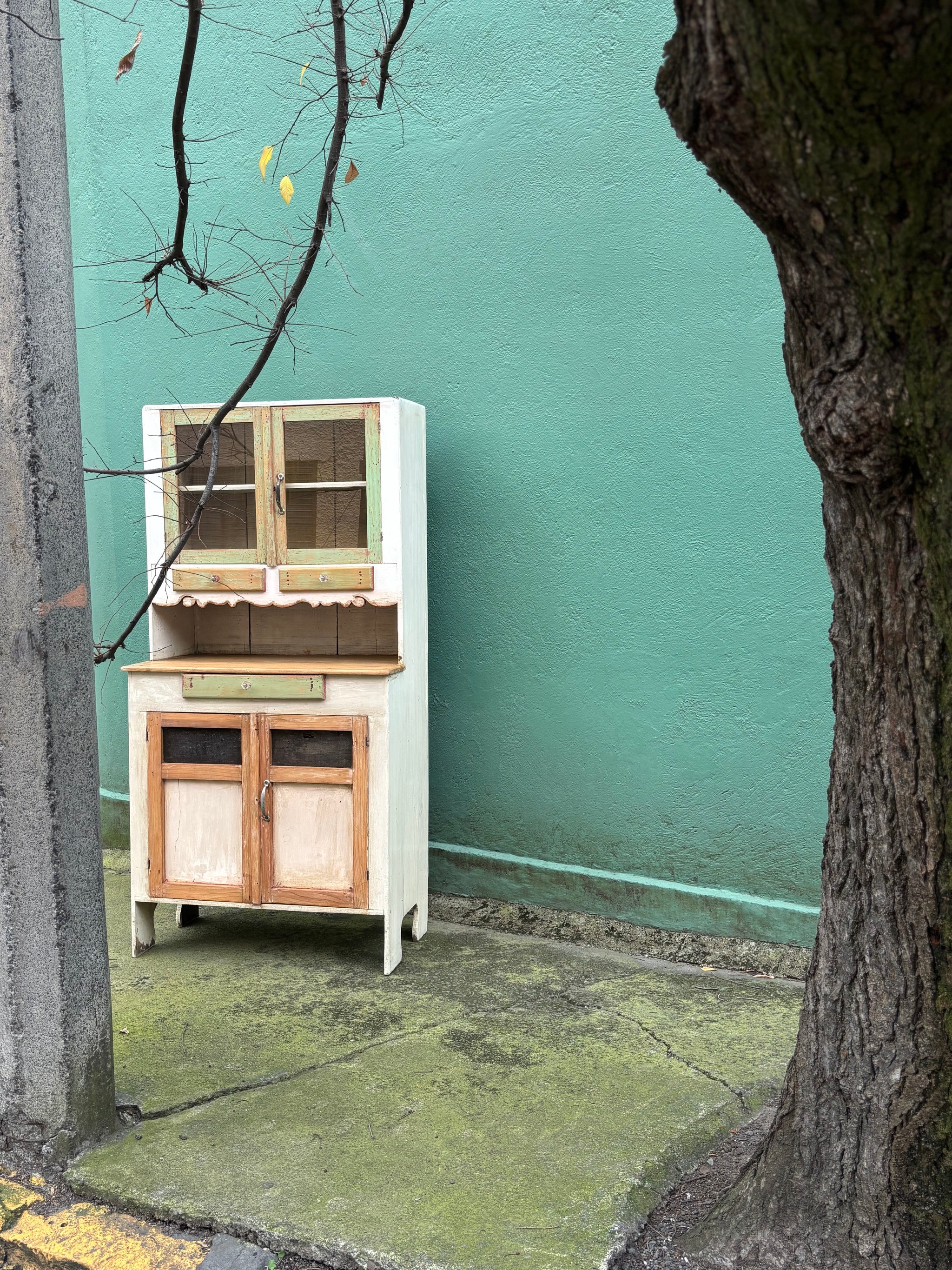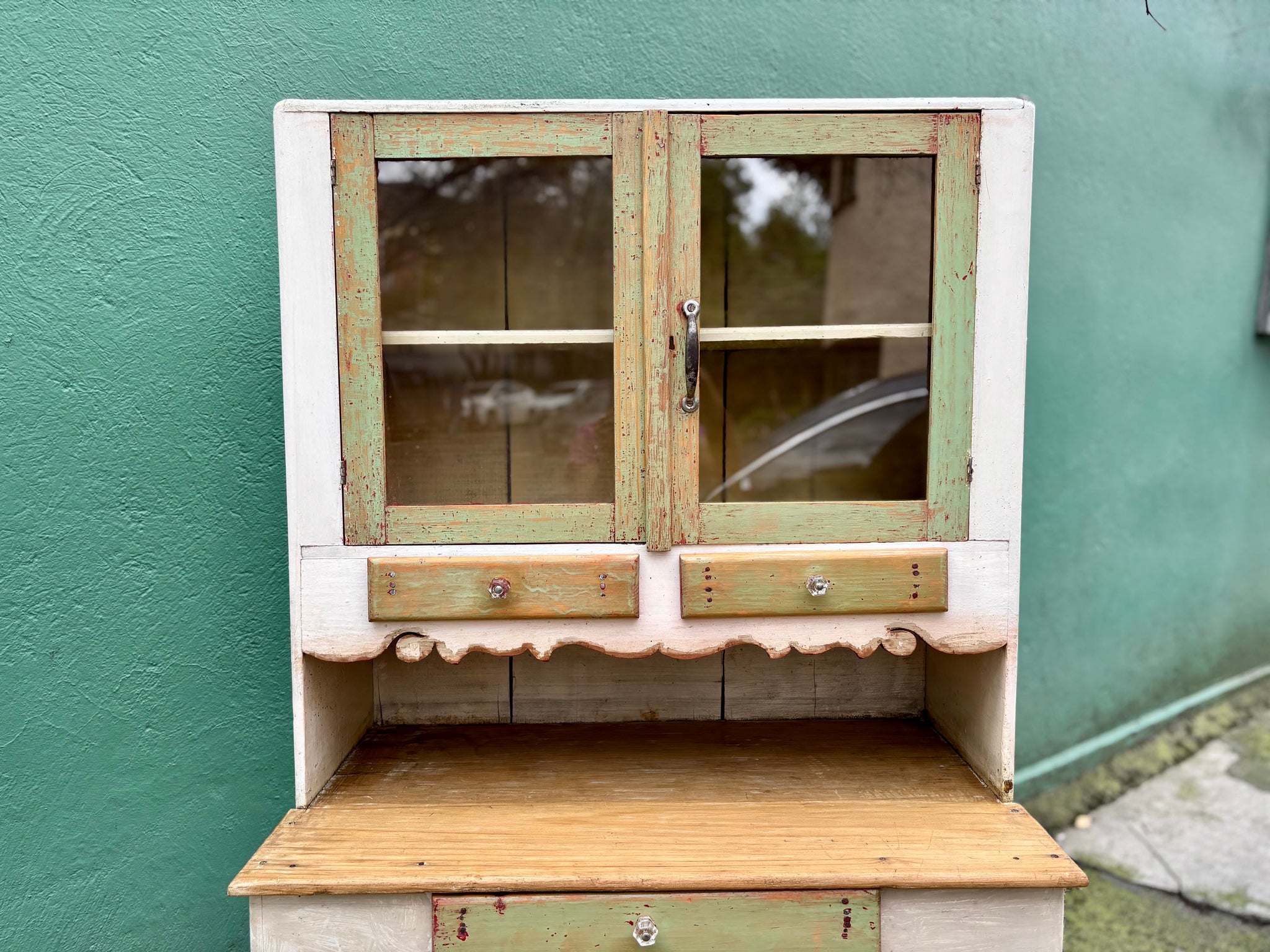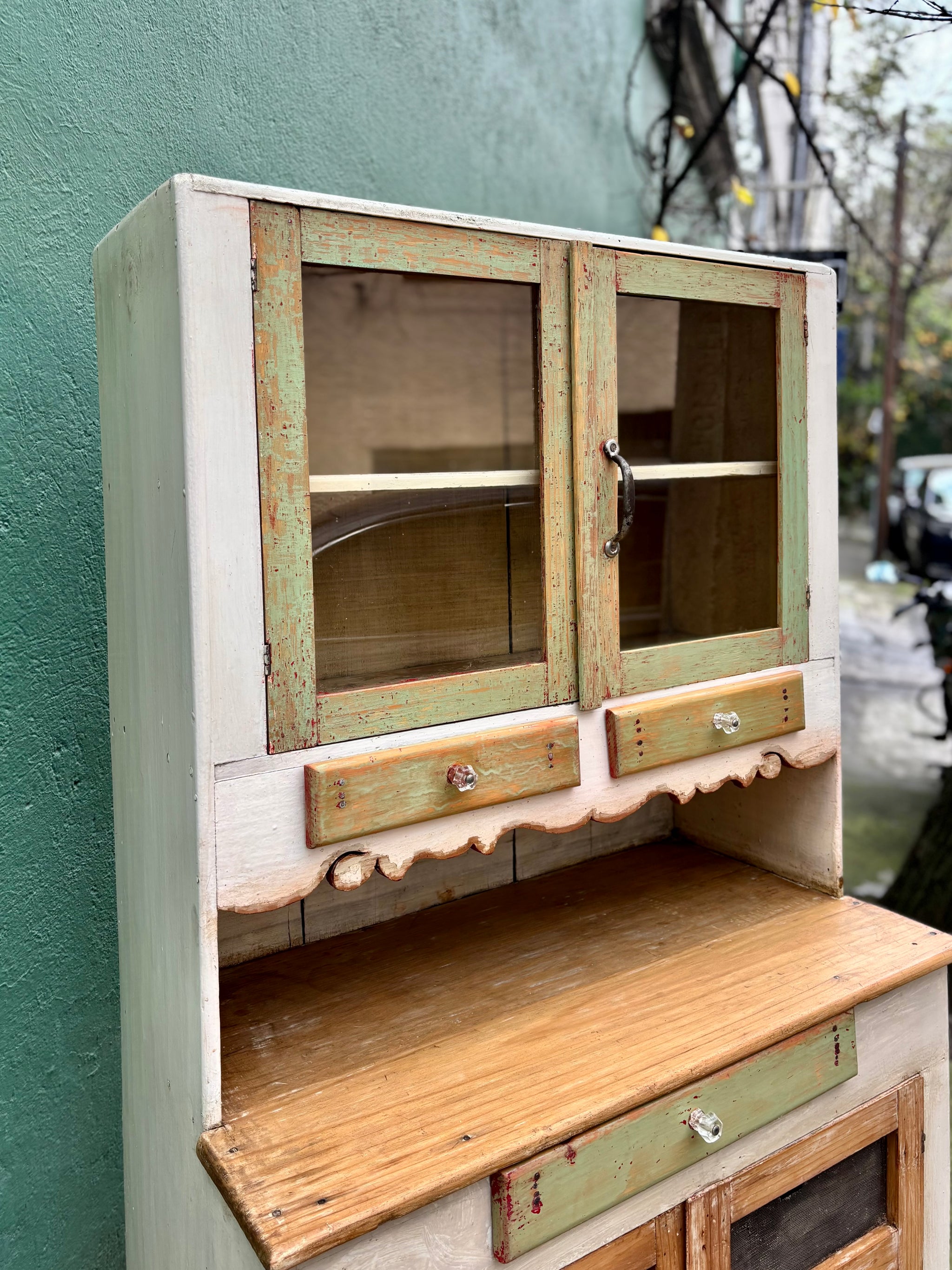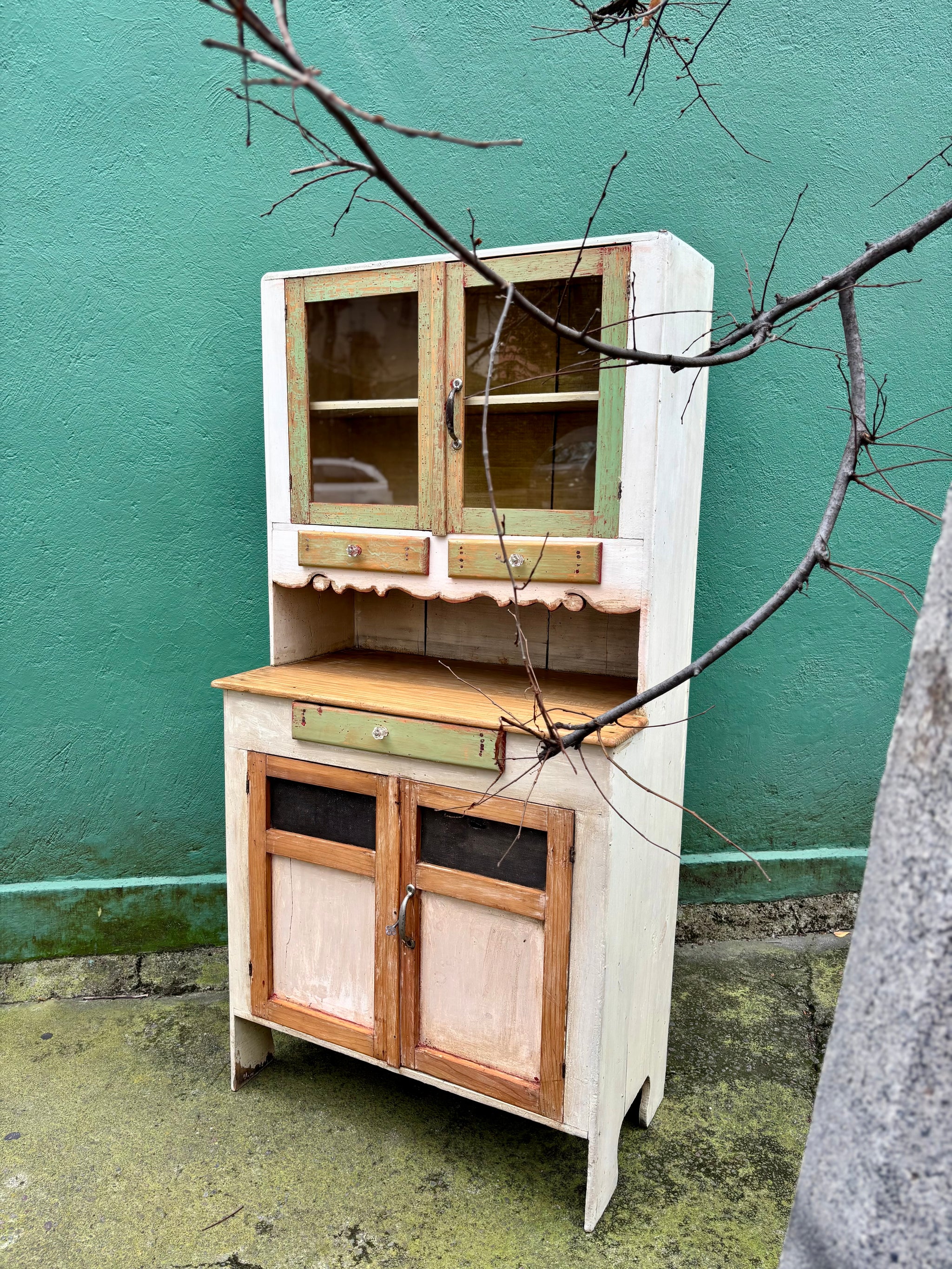 Antigua Alacena de cocina con pátina original, moldura tallada, cubierta de madera, jaladeras originales, elaborada a principios del siglo XX.