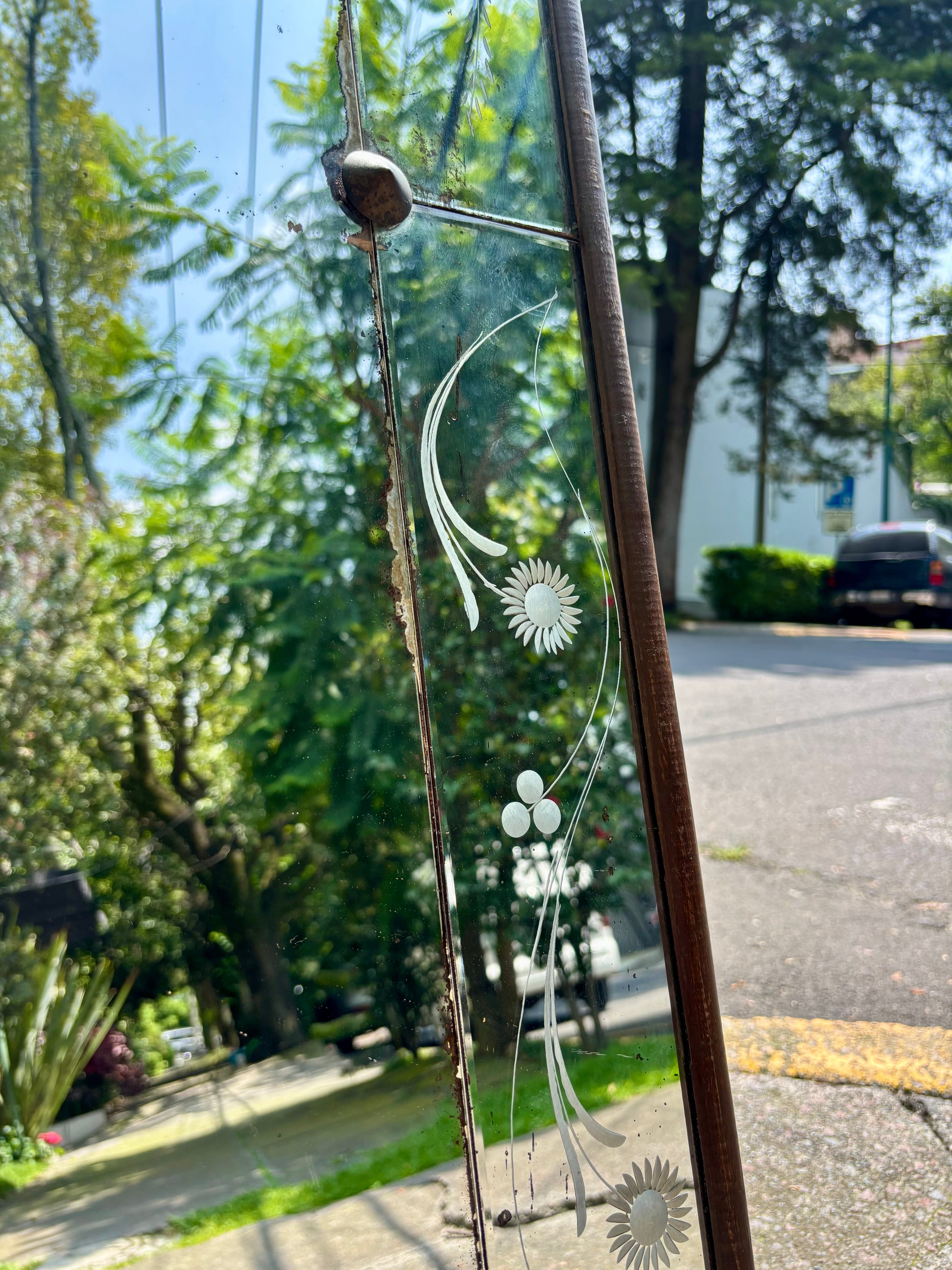 Marco de madera obscura tallada, luna original. Principios del S XX A. 94 cmsL. 73...