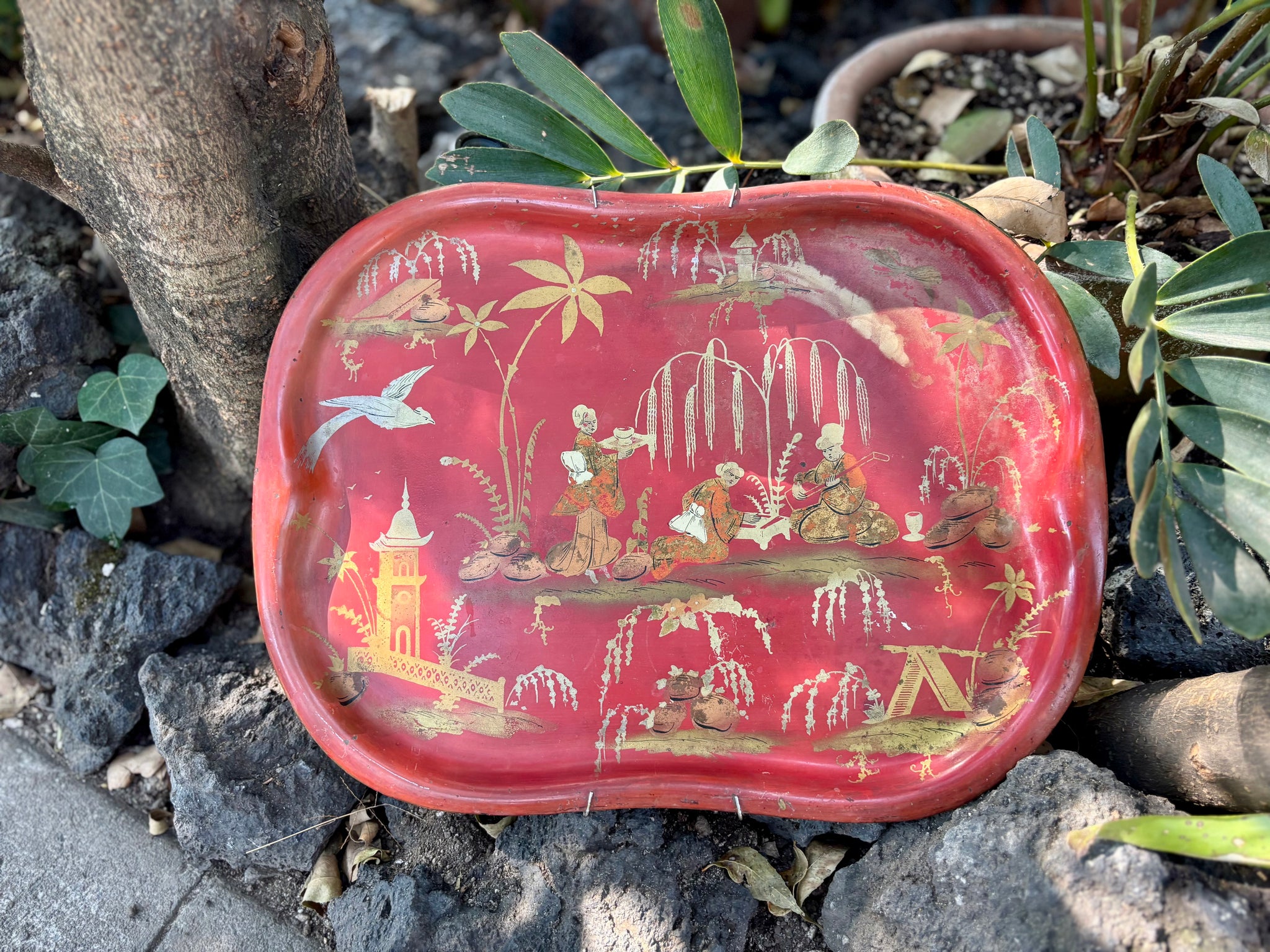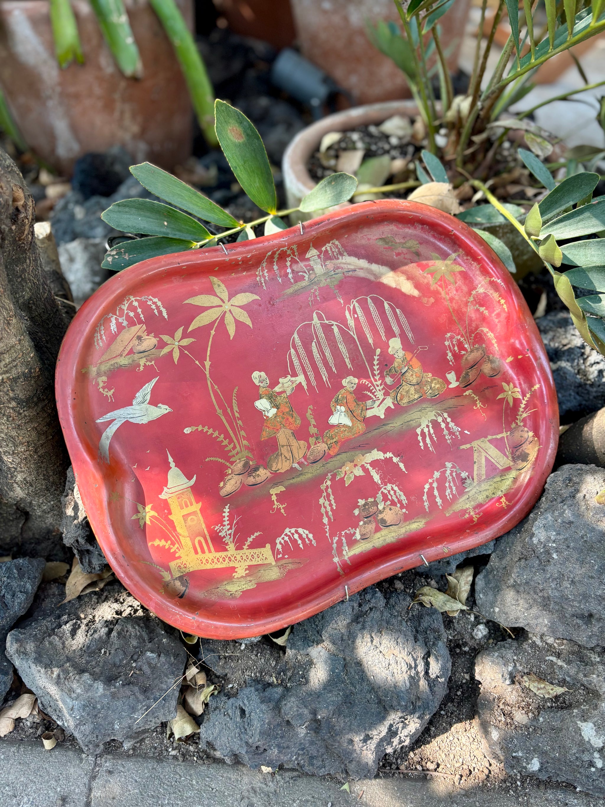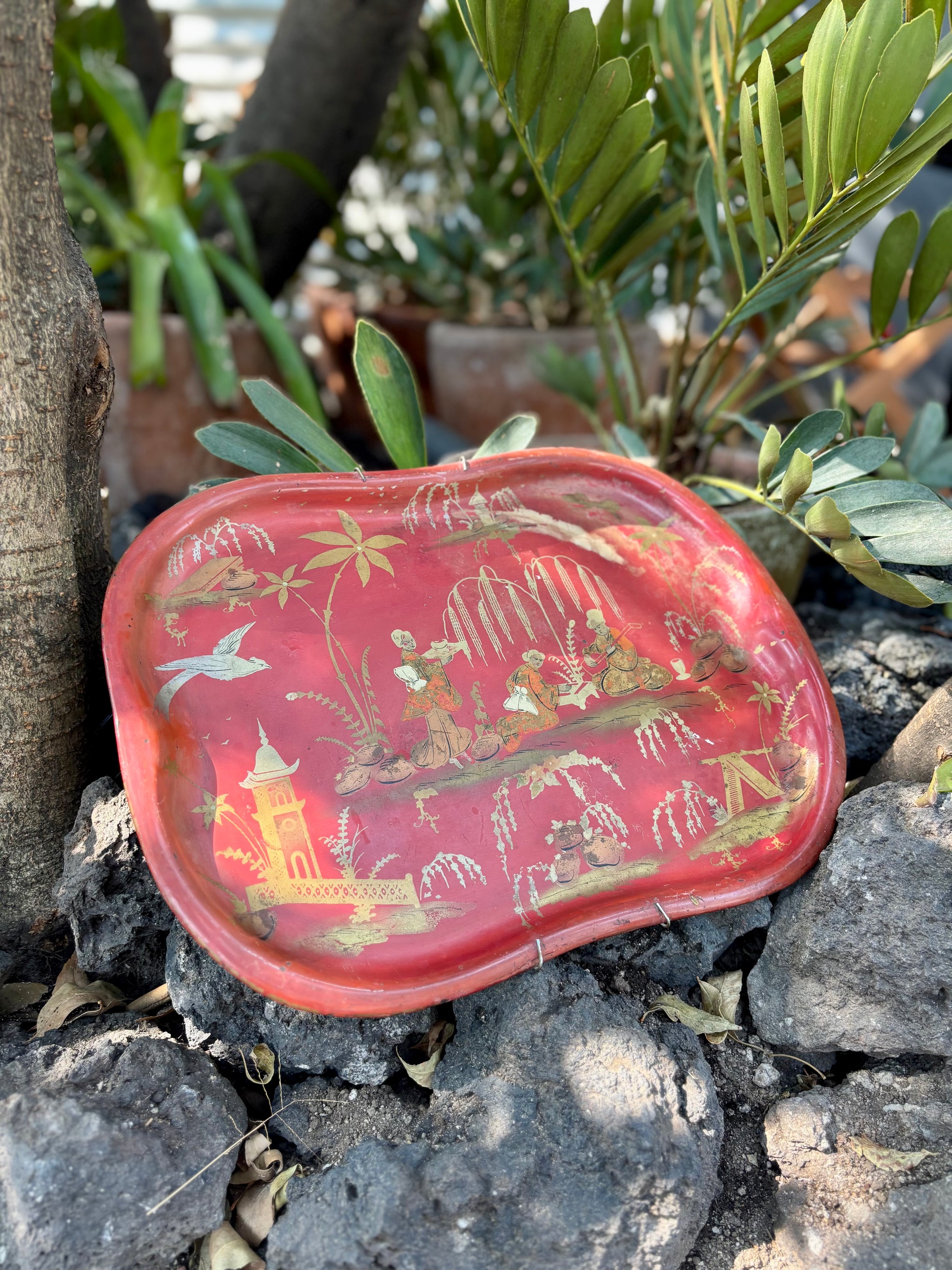 MedidasA. 3.5 cmsL. 31.5 cmsF. 42 cms Bandeja antigua de metal pintado, decorada con escena...